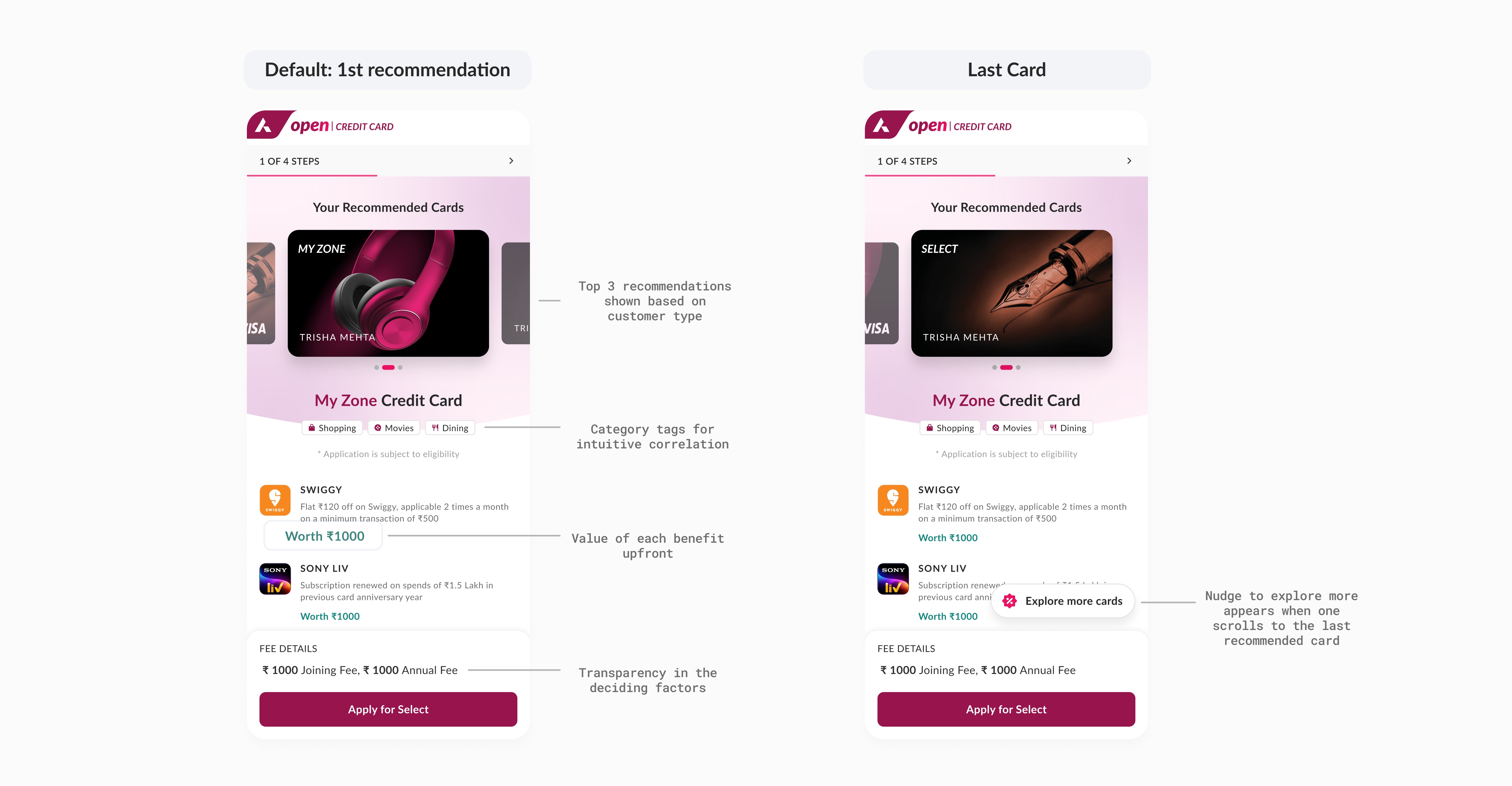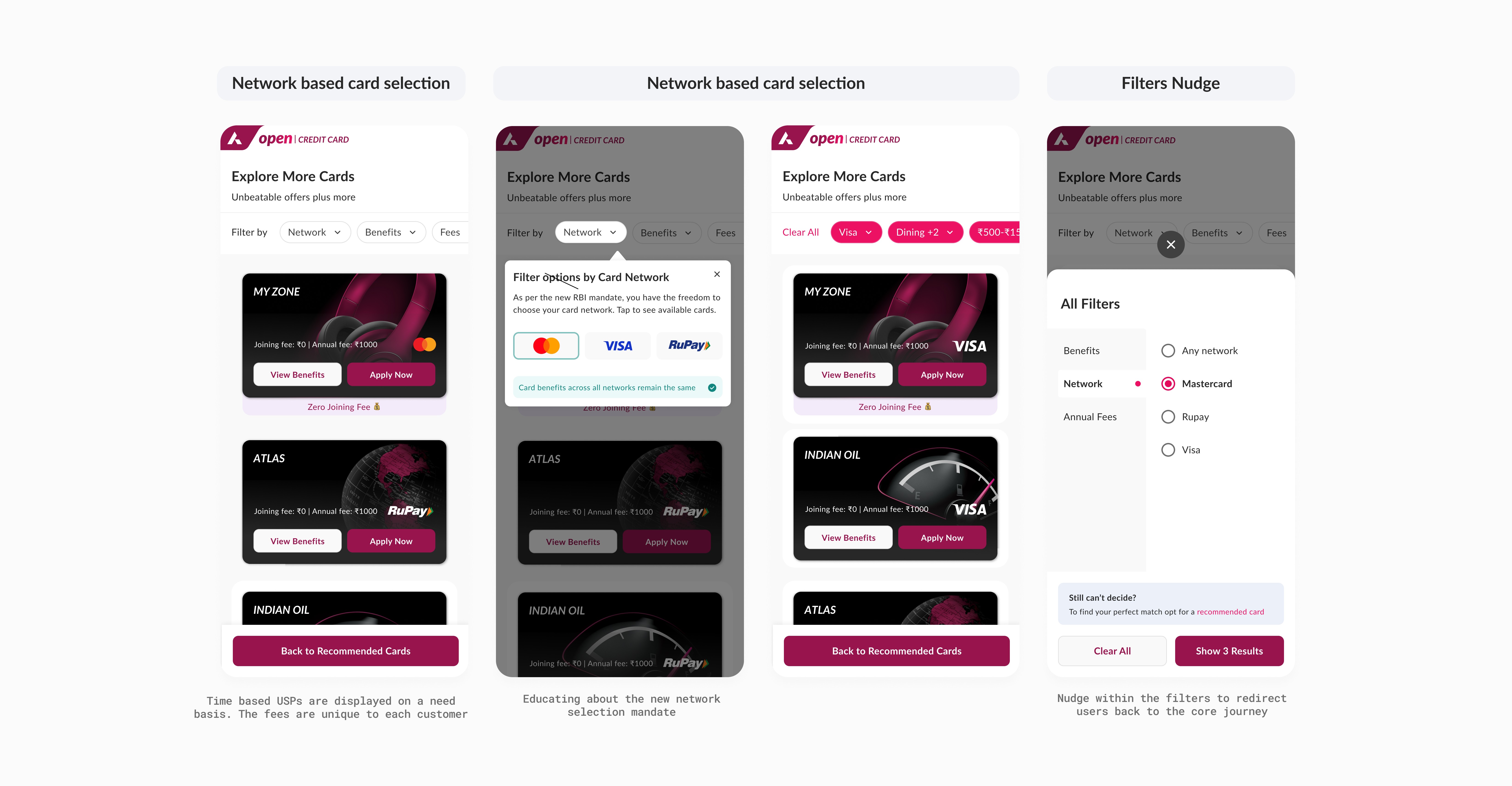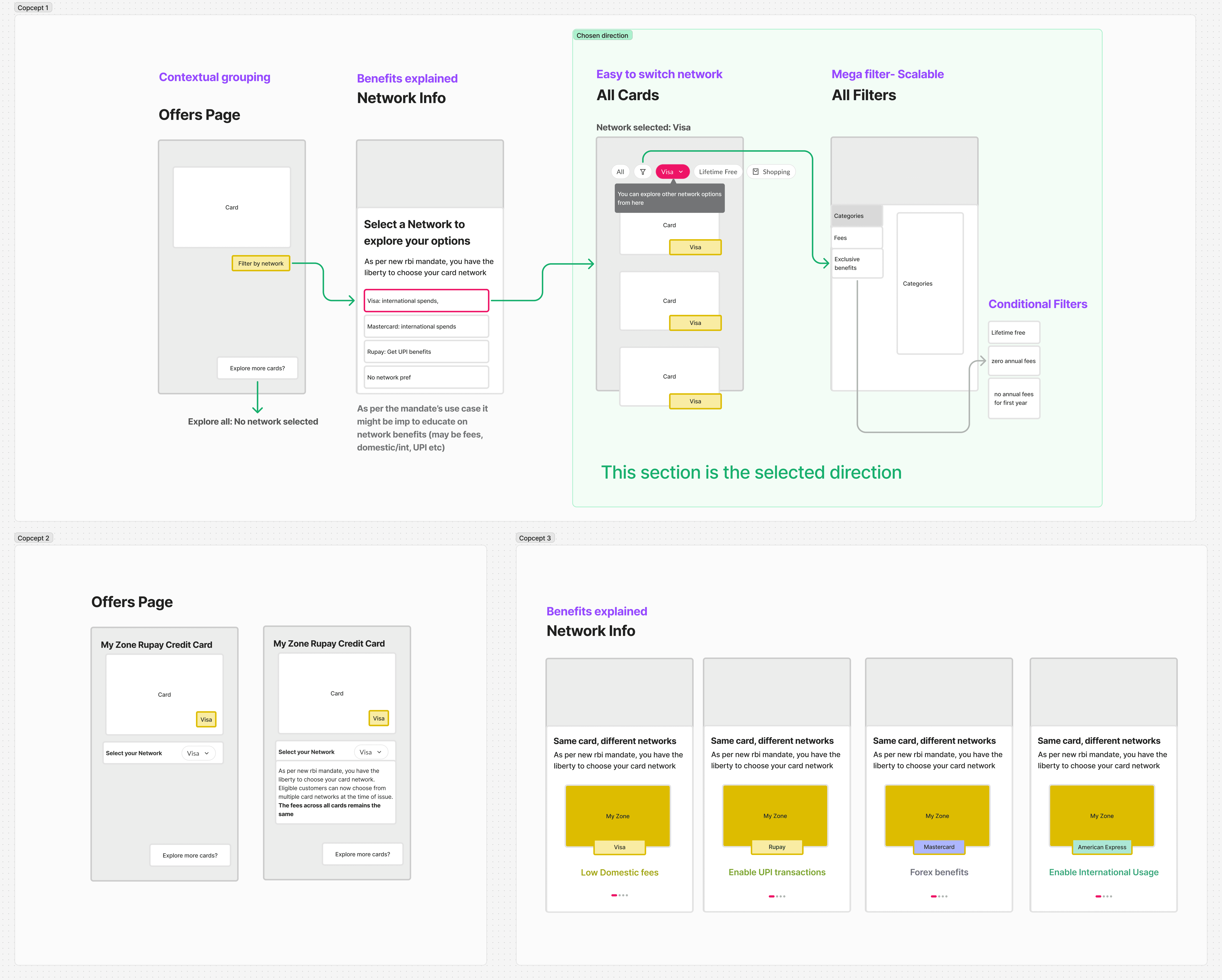 Concept explorations for network selection: Since a layman has no idea what card networks are, enough information needs to be provided on our journey to help them make an informed decision to choose. If they are not getting the answers here, they are surely dropping off to find them elsewhere.