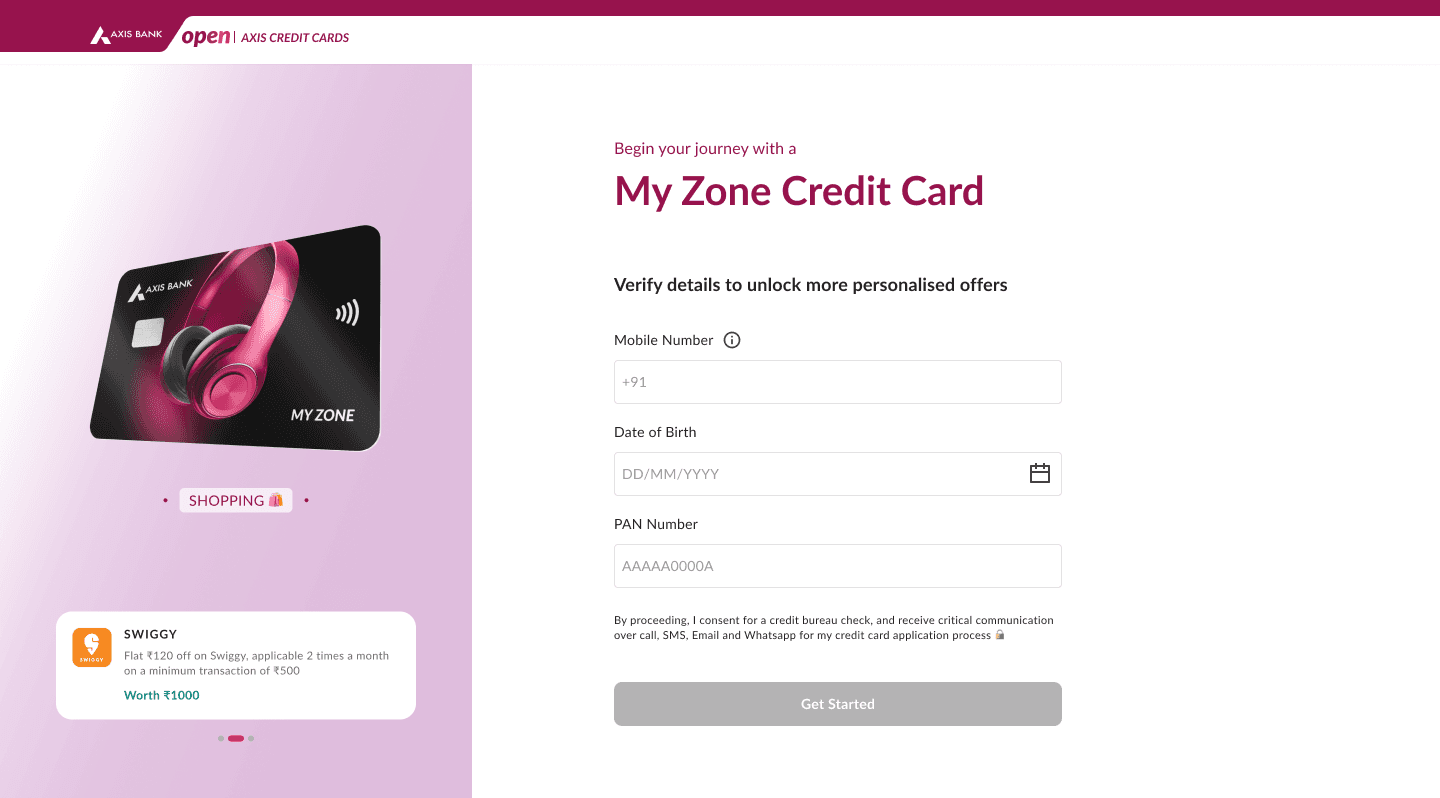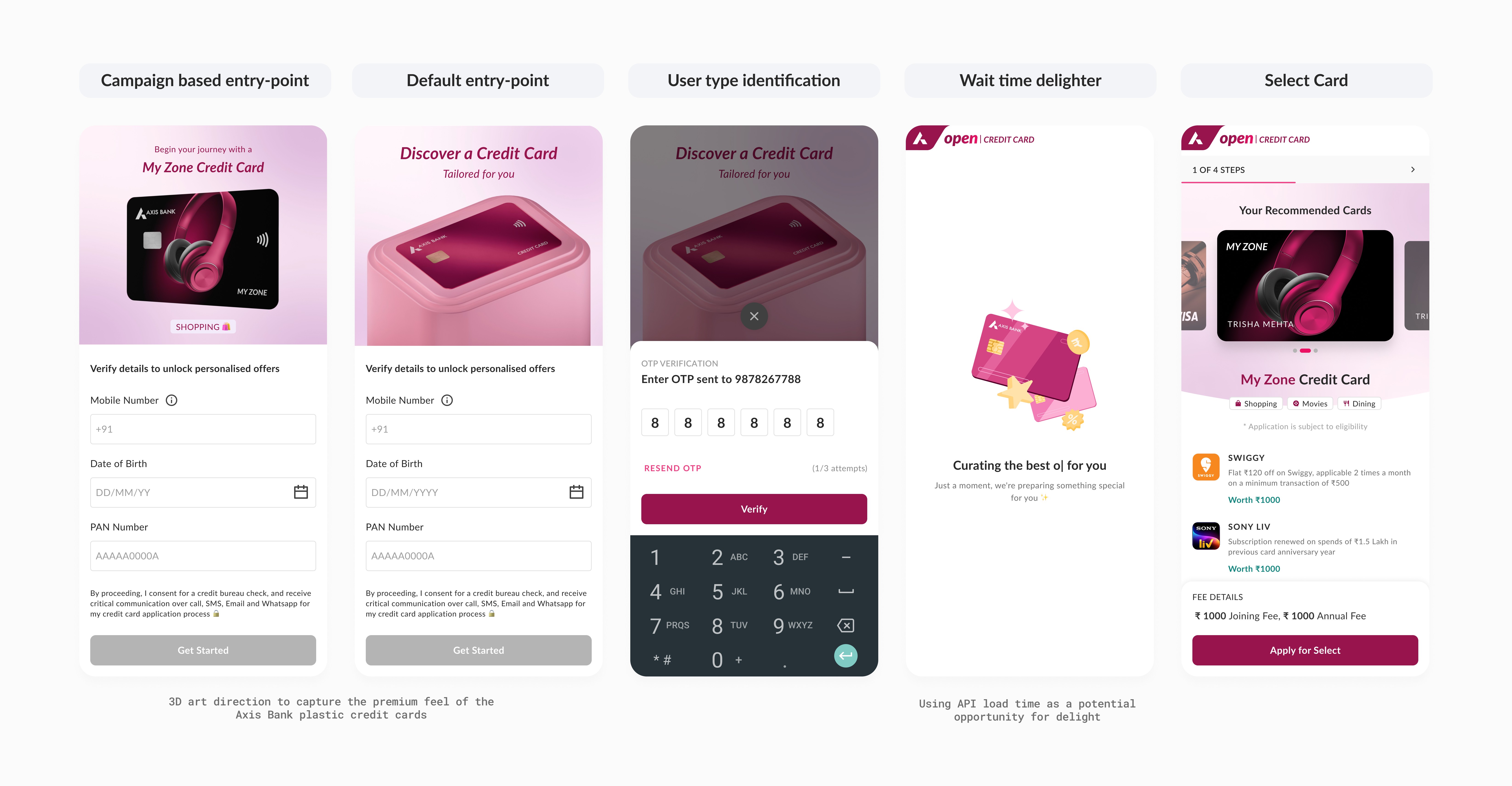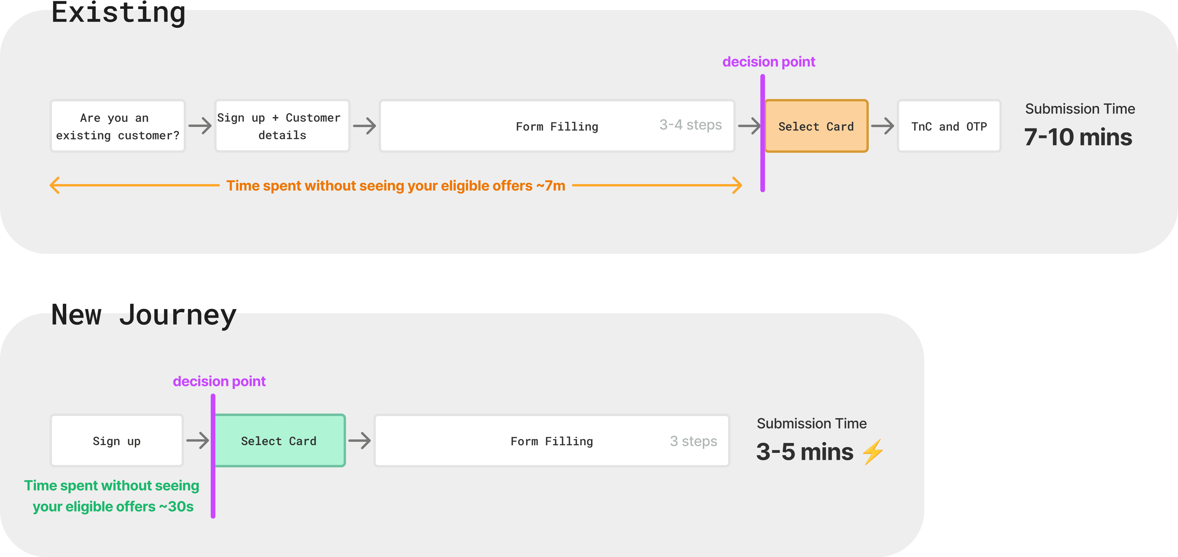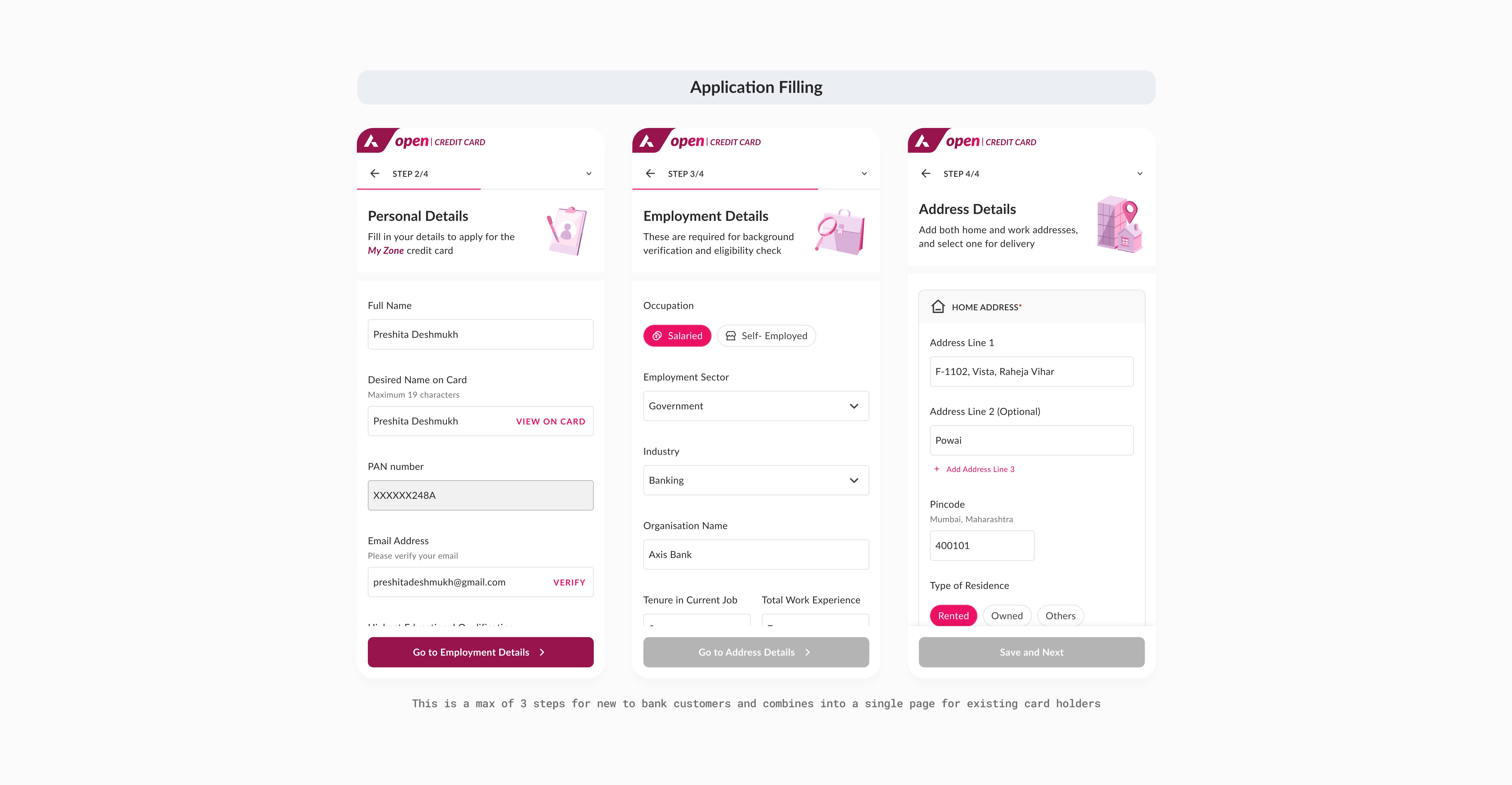 The form filling journey is a maximum of 3 steps for new and non pre-approved customers, 2 for Pre- approved and 1 for existing card holders (Multi-accounting)