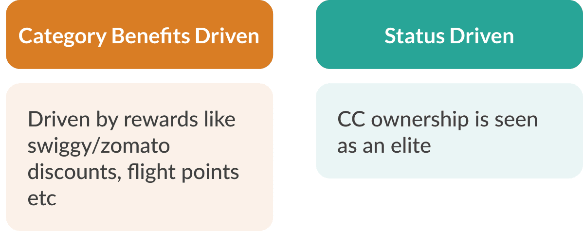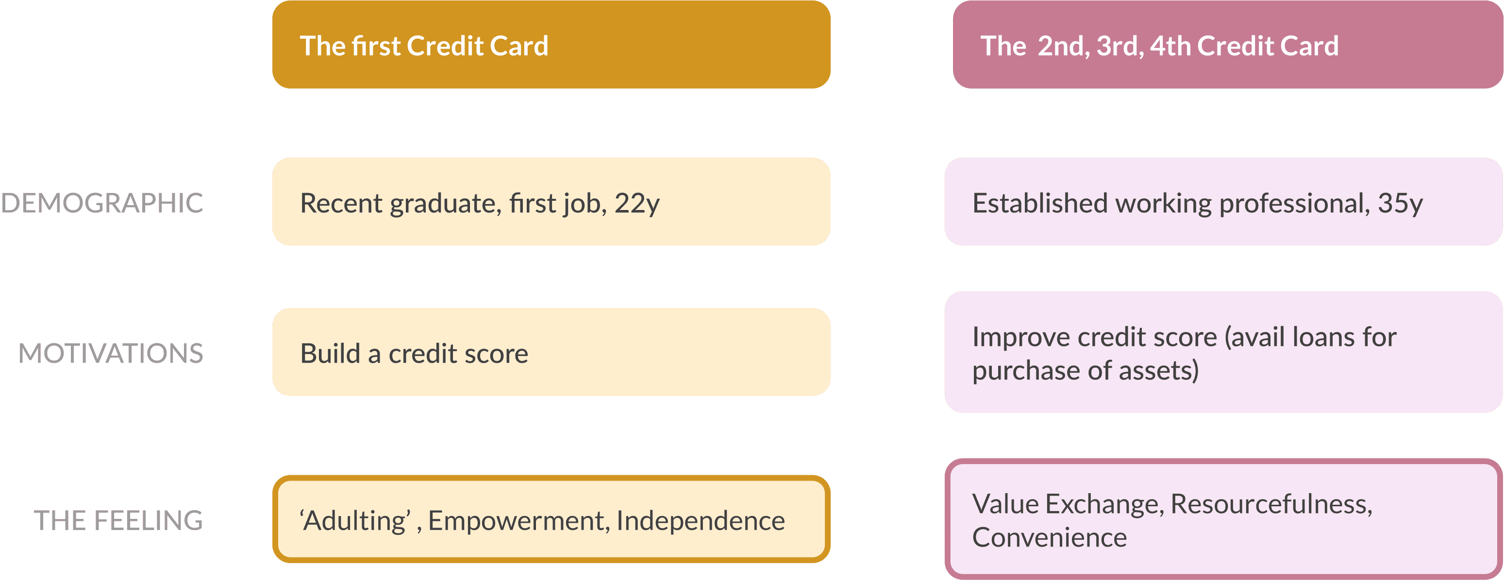 Imagine starting your first job, and the feeling of finally putting your money in the places you want, neatly arranging your cards in your wallet and taking it out to pay the bill (for the table of course). That’s the aspiration a credit card for this target audience needs to tap into. Post the first card people look for value, and nitpick on it. These folks already have relationships with other banks/ financial providers, a credit history and providers ready (aka: fighting for their attention) to offer them a card to their doorstep.