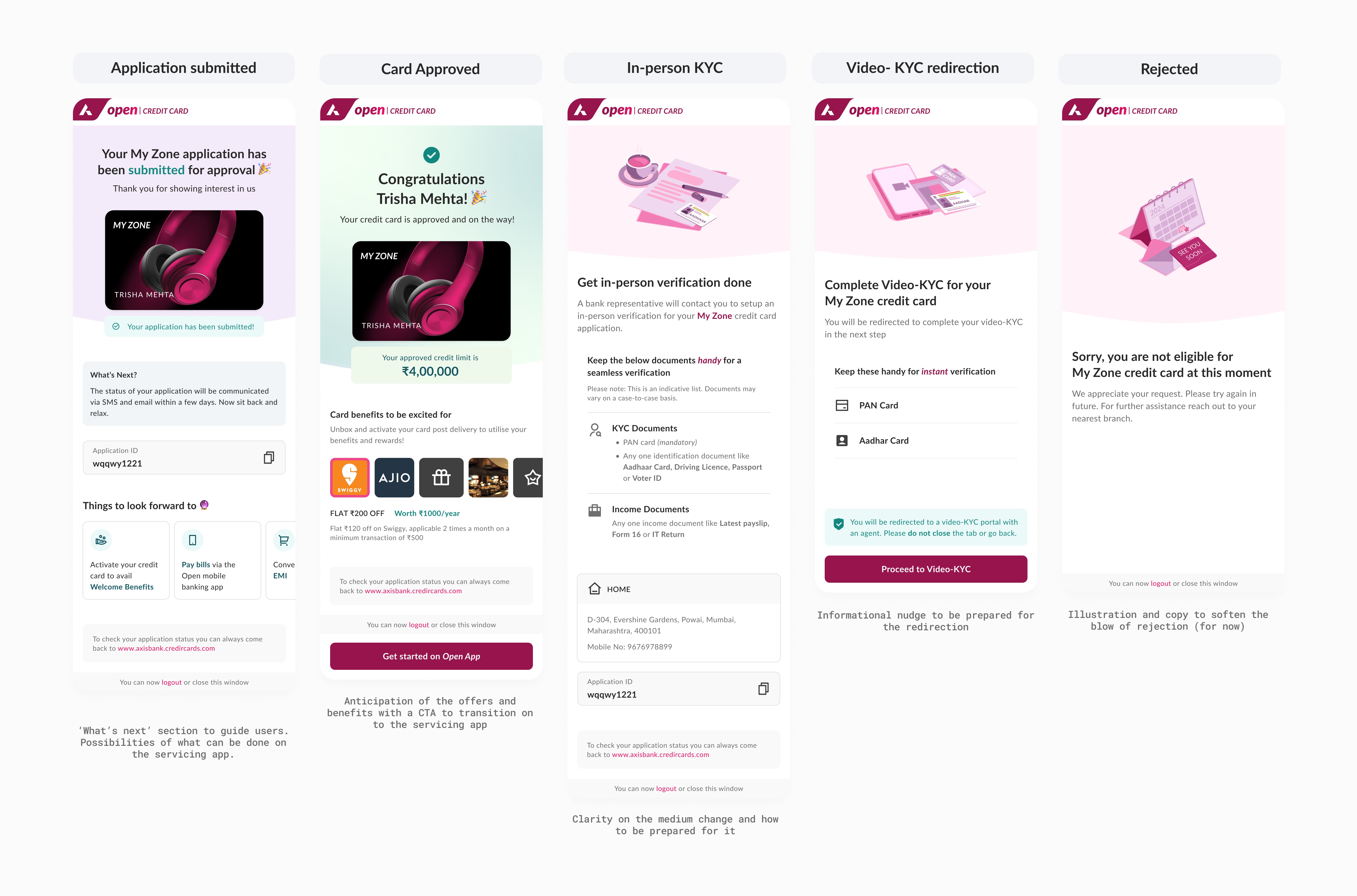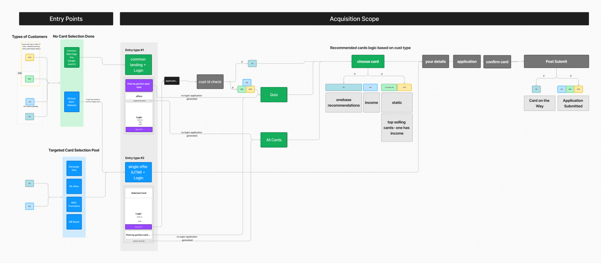 On studying the existing flows and business defined to-be journeys a simple task flow was laid out (from login -> submit form). Based on the insights multiple versions of the quiz were integrated into the desired flows for the best card shopping experience.