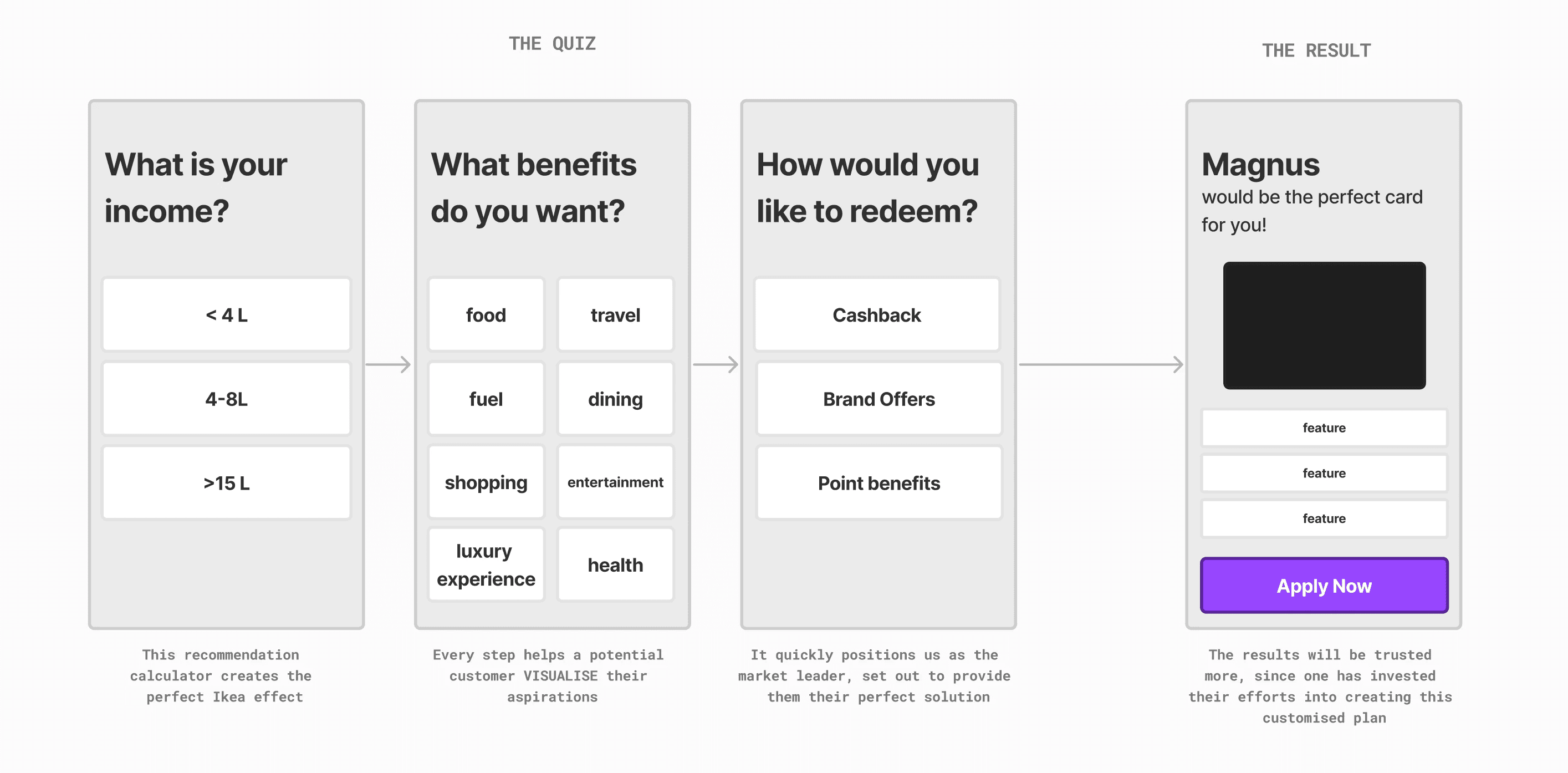 Since a full fledged quiz was a high effort task. As a tradeoff I suggested we make an MVP of the quiz using the existing recommendation matrix- this comprised of an income cutoff, category benefits and USPs (already used for offers page)