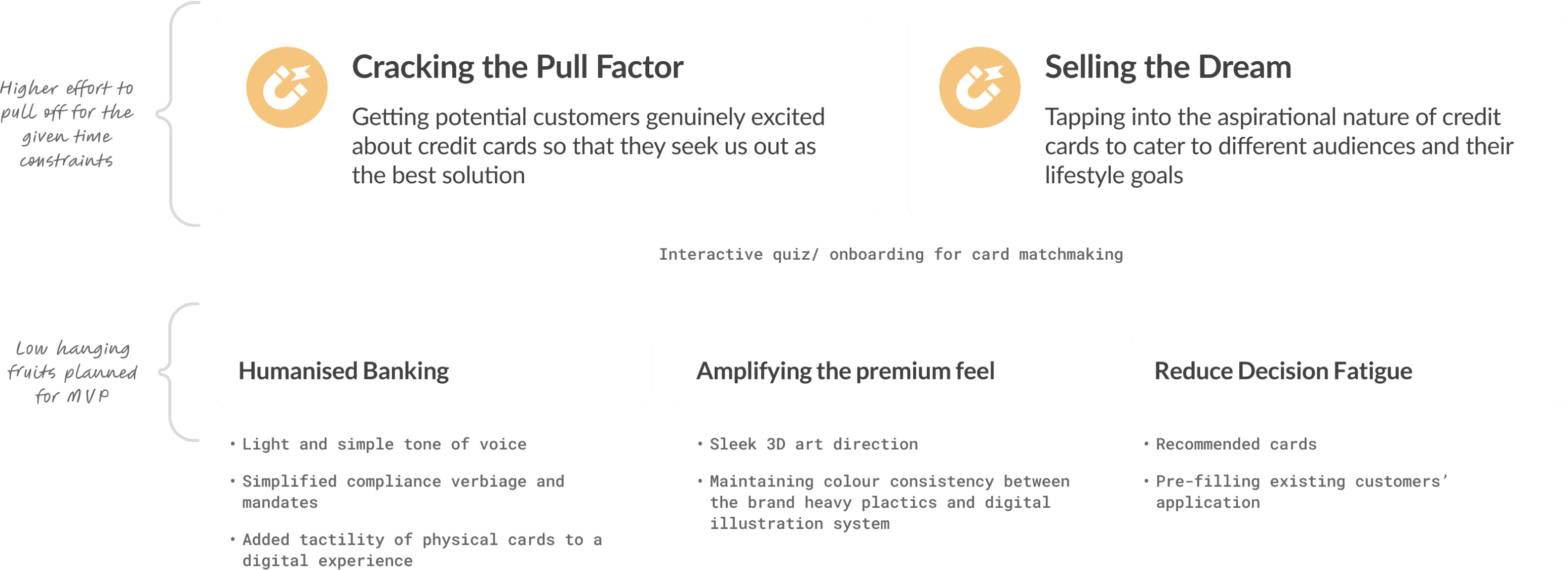 Here my critical value add was to help bridge the gap between our acquisition journey and credit card servicing, and provide a means to redirect users to the mobile banking app to get started. Contextual information was brainstormed.